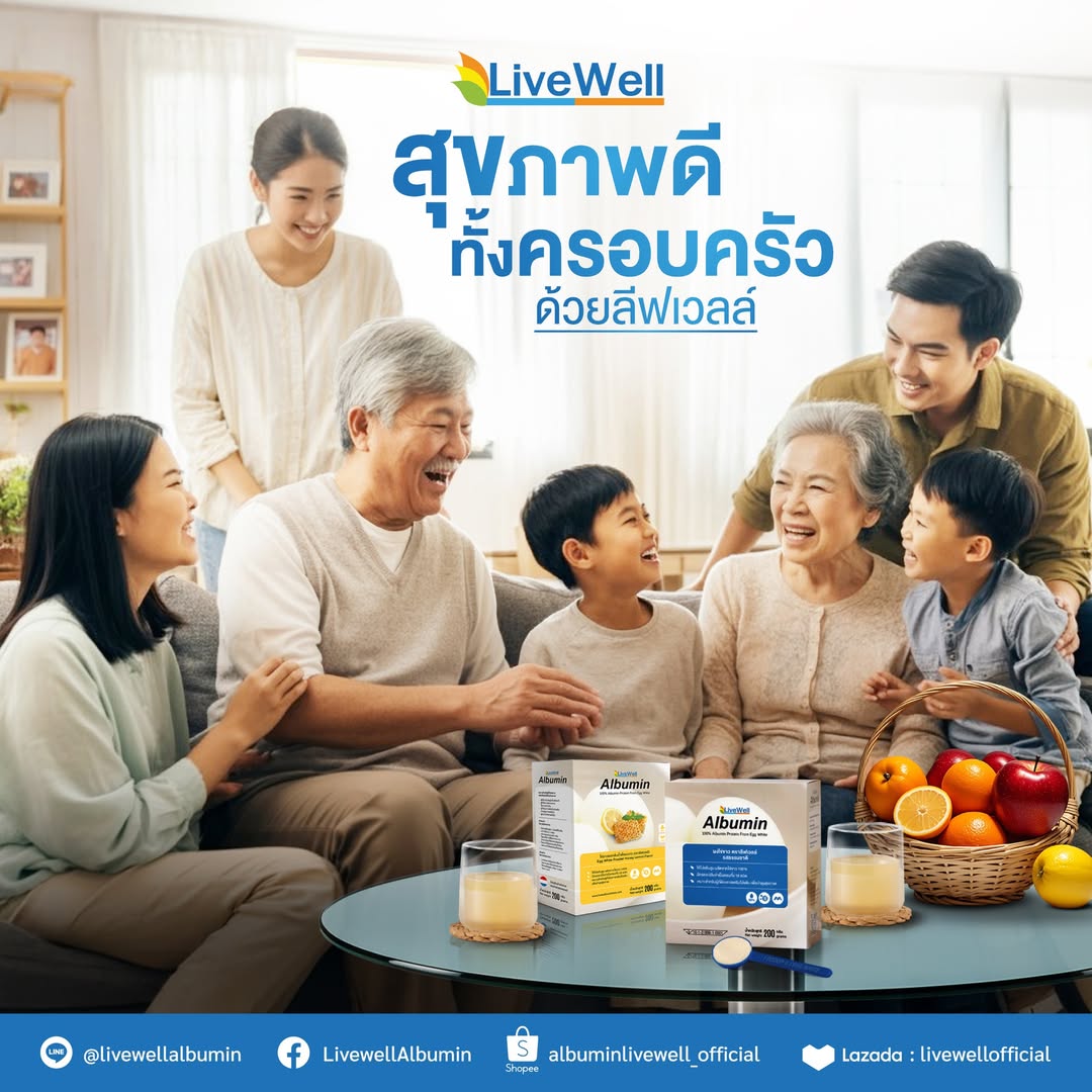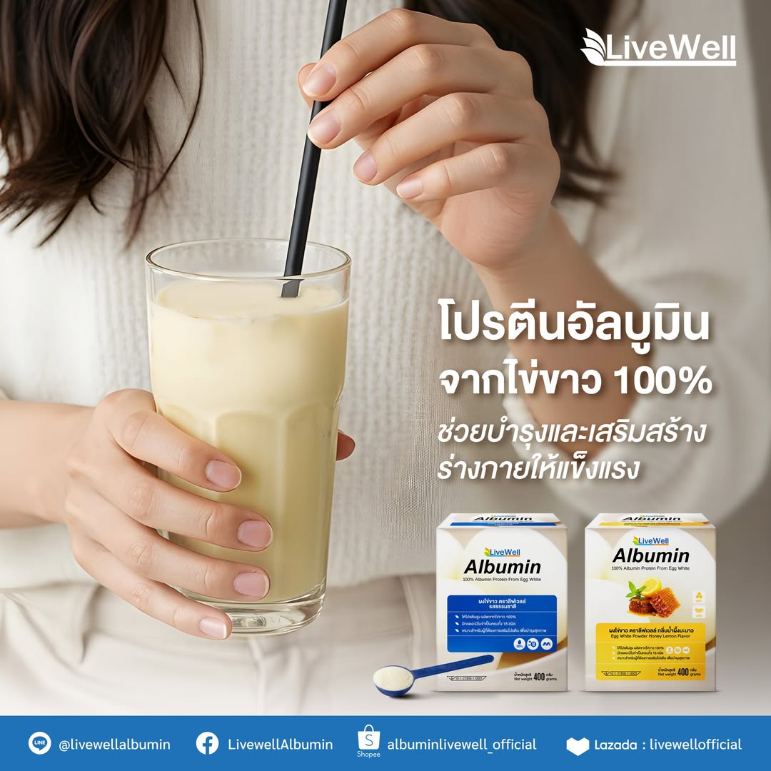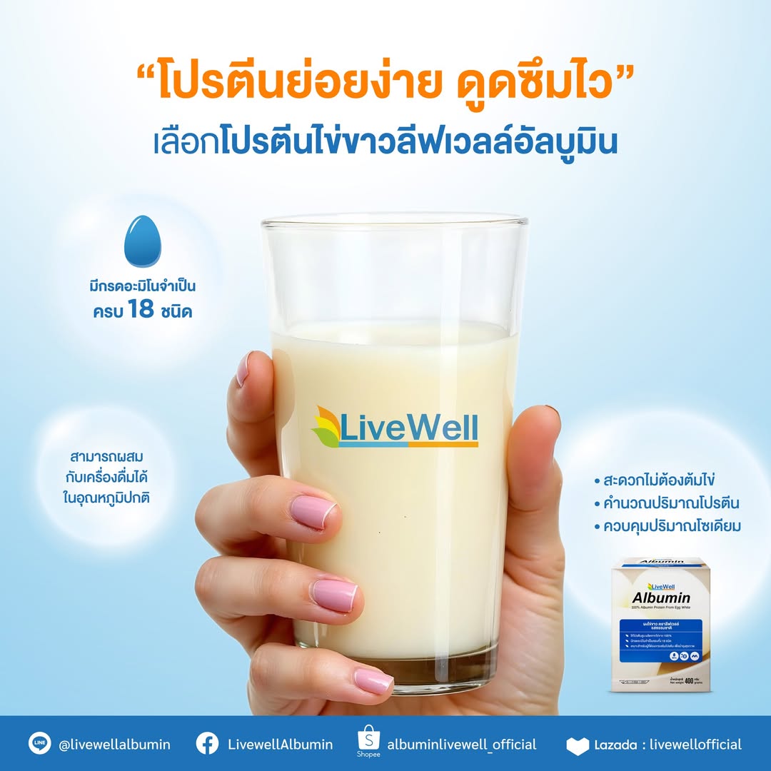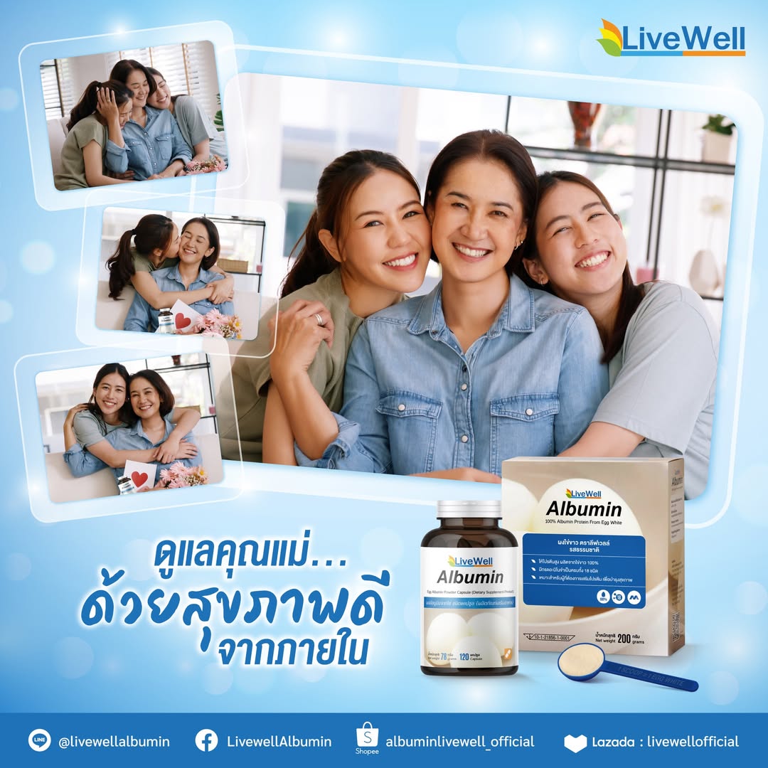 “ดูแลแม่…ด้วยสุขภาพดีจากภายใน” โปรตีนดีๆ สำหรับผู้สูงอายุ ไข่ขาวไม่มีคอเลสเตอรอล ย่อยง่าย เหมาะสำหรับผู้ที่รักสุขภาพ “แทนคำว่ารัก ด้วยสุขภาพดีเน้นๆ จากผงโปรตีนไข่ขาว” ลีฟเวลล์ขอแนะนำ โปรตีนสกัดจากไข่ขาว 100% Livewell Albumin รับประทานง่าย สะดวก ไม่ต้องเสียเวลาต้มไข่ และคำนวณปริมาณโปรตีนที่ต้องรับประทานต่อวันง่าย มีทั้งแบบชนิดผง ชนิดเม็ด และแคปซูล ทานสะดวก ย่อยง่าย ไม่เสียเวลาต้มไข่ พร้อมรับประทาน