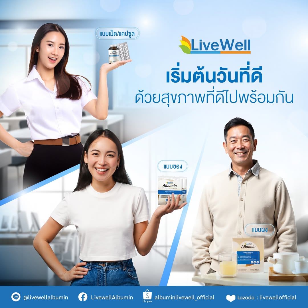 มีนาแล้ว มีลีฟเวลล์ ติดไว้ดีแน่ๆ ปัจจุบันอาหารเสริมกลายเป็นอีกหนึ่งทางเลือกของคนรักสุขภาพ เพราะช่วยตอบโจทย์เรื่องสุขภาพของเราได้อย่างตรงจุด การดูแลสุขภาพจึงง่ายขึ้น สะดวกสบายกว่าเดิม แล้วมีนานี้ มีโปรตีนไข่ขาว ลีฟเวลล์อัลบูมิน ติดไว้ยังไงก็ดี LiveWell ขอแนะนำ#แบบแคปซูล เหมาะสำหรับผู้ที่มีปัญหาเรื่องระบบการย่อยหรือย่อยยาก ไข่ขาว เป็นแหล่งโปรตีนอัลบูมินจากธรรมชาติที่ดีสุด โปรตีนไข่ขาว 100% ลีฟเวลล์อัลบูมิน ไม่มีไขมัน ทานสะดวก ย่อยง่าย ไม่เสียเวลาต้มไข่ *สามารถทานได้ 3-6